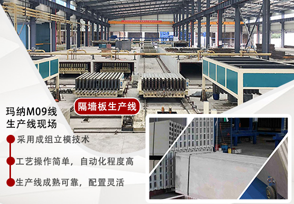 瑪納公司輕質隔墻板生產線設備價格從數十萬到數百萬不等,其中M09型墻板生產線整體技術采用公司自主創新研制開發的新型成組立模技術裝備(系原始技術創新開發,獲得MN級技術鑒定),采用立模法機組流水工藝生產,該線使用瑪納多項技術做支撐,擁有完全的自主知識產權,主要滿足用戶大規劃、高品質、高度機械自動化的產品需要,是現在先進的生產工藝裝備之一。