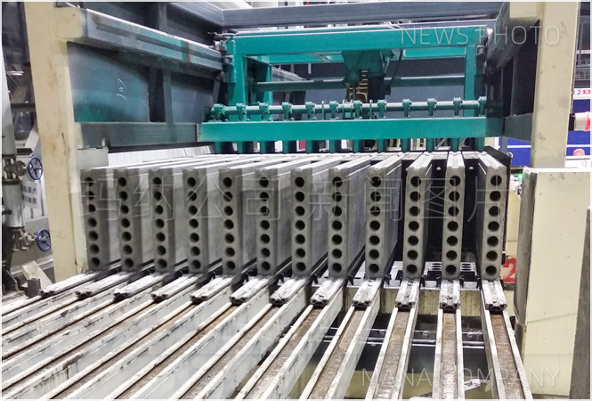 該線采用立模法機組流水工藝,實現模具自動開合,機械上面成型,自動抽芯穿芯,自動出板等工藝技術。單線產能:100萬m²/年,單線單班用工:人工14 -16人/班。