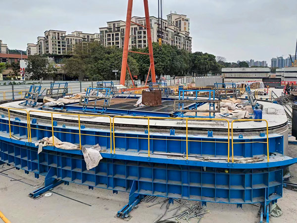 傳統(tǒng)的混凝土管節(jié)預(yù)制采用內(nèi)、外部簡易支架和組合小鋼;蚰灸,人工澆筑混凝土的方法,此工藝需要投入的人工較多,由于預(yù)制管節(jié)直徑較小,工作面小,工效較低,所以每節(jié)預(yù)制管模板及支架施工的時(shí)間較長,機(jī)械化施工程度也不高,且模板接縫處混凝土不飽滿及混凝土外觀質(zhì)量較差。超大斷面管節(jié)因截面尺寸較大,外輪廓尺寸大,每節(jié)段重量超過百噸,從而管節(jié)的預(yù)制模具需要結(jié)構(gòu)強(qiáng)、尺寸大,重量重,傳統(tǒng)圓形模具拆裝困難,甚至無法拆裝。傳統(tǒng)工藝需要投入的人工較多,由于預(yù)制管節(jié)直徑較小,工作面小,工效較低,所以每節(jié)預(yù)制管模板及支架施工的時(shí)間較長,機(jī)械化施工程度也不高,且模板接縫處混凝土不飽滿及混凝土外觀質(zhì)量較差。傳統(tǒng)的翻轉(zhuǎn)吊具翻轉(zhuǎn)管材時(shí),翻轉(zhuǎn)速度太快,由于管材自身重量太大,慣性產(chǎn)生額外沖量,降低吊具安全性能,容易發(fā)生事故,使管子產(chǎn)生局部裂縫和缺角掉邊的現(xiàn)象。超大口徑管子混凝土方量大,加料次數(shù)多,傳統(tǒng)的將軍帽布料不均勻,不但增加了振搗的工作量而且也會給混凝土帶來密實(shí)度不均勻的問題。