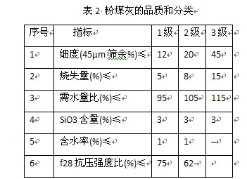 粉煤灰多出于電廠煤粉爐中,由于電廠用電負荷有高峰和低谷,以及原煤煤種的差異,因此粉煤灰的質量是有波動的。粉煤灰的品質和分類見表2。