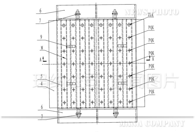 成組立模是建筑用條形墻板的專用生產(chǎn)設(shè)備。它是以成型模腔M為主體,成型模腔M是由底架3、底板4、隔板5、開啟堵板6、上壓板8等模塊圍成的六面體成型空腔(詳見圖1~圖3)。條形墻板就是通過向成組立模的成型模腔M中澆注所需板材的料漿并經(jīng)過凝固、養(yǎng)護后得到的外形與成型模腔完全一致的六面體。條形墻板的六個面分別是兩個側(cè)面、四個邊模面。其中墻板的側(cè)面是由垂直于水平底邊模并等間距布置的隔板來實現(xiàn)其成型的,即條形墻板的側(cè)面在成組立模中成型時一定處于與地面垂直的狀態(tài)。但四條邊模面在傳統(tǒng)成組立模中的安裝位置分為兩種:側(cè)立式和豎立式。所謂側(cè)立式是指兩個長邊邊模面呈上、下水平對稱布置,兩個短邊邊模面呈左、右豎直對稱布置;而豎立式正好與此相反,是兩個短邊邊模面呈上、下水平對稱布置,兩個長邊邊模面呈左、右豎直對稱布置。但無論是哪種成型拼裝方式,總有兩個邊模面是呈上、下水平對稱布置的。當(dāng)通過注料孔(ZLK)向封閉的模腔中進行壓力注料時,隨著注入料漿的增多模腔里的空氣逐步被擠壓上移,最后聚集到上壓板8附近。如果氣體不及時排出,對上壓板附近料漿的流動及上成型面的成型質(zhì)量都有嚴重的不良影響。為了使模腔內(nèi)的氣體能夠排出,在上壓板8上需設(shè)置排氣孔(PQK)。為了使用排氣順暢,排氣孔的數(shù)量越多越好。但是在排氣孔附近的成型質(zhì)量肯定不理想,排氣孔數(shù)量越多則相應(yīng)的上成型面(即上邊模面)的成型質(zhì)量越差。而且,即使排氣孔數(shù)量再多,其中間也有一定的間隔距離,再加上排氣孔容易阻塞(因為排氣孔不可能太大),以至于上成型面不可避免地經(jīng)常發(fā)生“氣堵”或者出現(xiàn)大氣泡,嚴重影響上成型面(即上邊模面)的成型質(zhì)量。