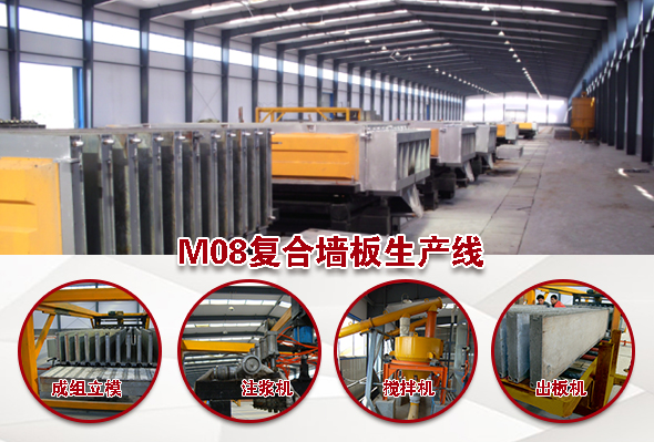 瑪納公司M08復合墻板生產線采用自主研發的成組立模技術,價格可依據客戶投資選擇,一條生產線投入一般二百多萬左右,標準生產線產能50萬㎡/年,主要針對有大規劃,高品質以及機械高度自動化的客戶。M08復合墻板墻板生產線主要設備組成: