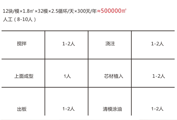 瑪納公司M08復合墻板生產線整體技術采用MANA公司自主創新研制開發的新型成組立模技術裝備,機械結構簡單,工作安全可靠,尤其是其一次性可成型多塊墻板,成型效率高,大大提高了墻板的生產效率以及企業的經濟效益;采用半自動化操作生產,不僅節省勞動力,而且便于流水線生產,使生產效率高,占用場地少。